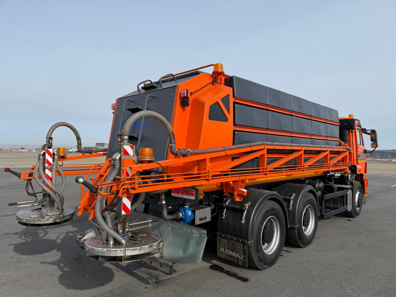 Новая техника, созданная на базе надежного шасси КамАЗ-6520, оснащена специальным оборудованием, включая емкость для жидкого реагента объемом 12,5 тысяч литров. Чтобы распределить реагент на ВПП, потребуется около 3,7 тысяч литров реагента, что позволяет машине обработать всю необходимую площадь, а также рулежные дорожки и стоянки без дозаправки.