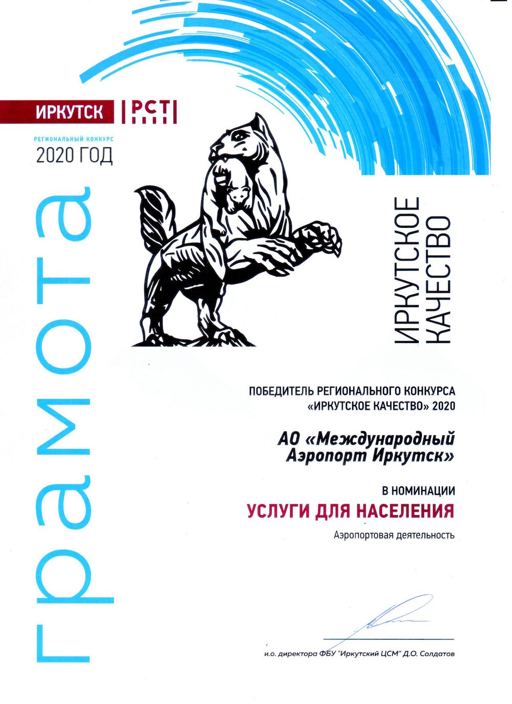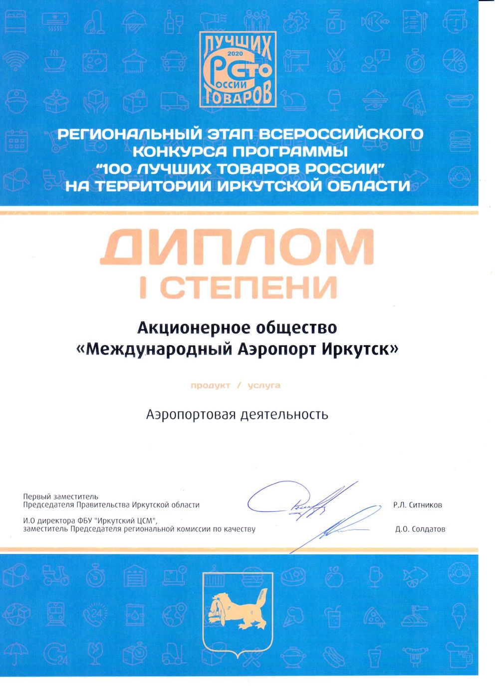 Предприятие получило Диплом I степени регионального этапа всероссийского конкурса программы «100 лучших товаров России», а также Грамоту победителя регионального конкурса «Иркутское качество». Аэропорт Иркутска признан лучшим в номинации «Услуги для населения».