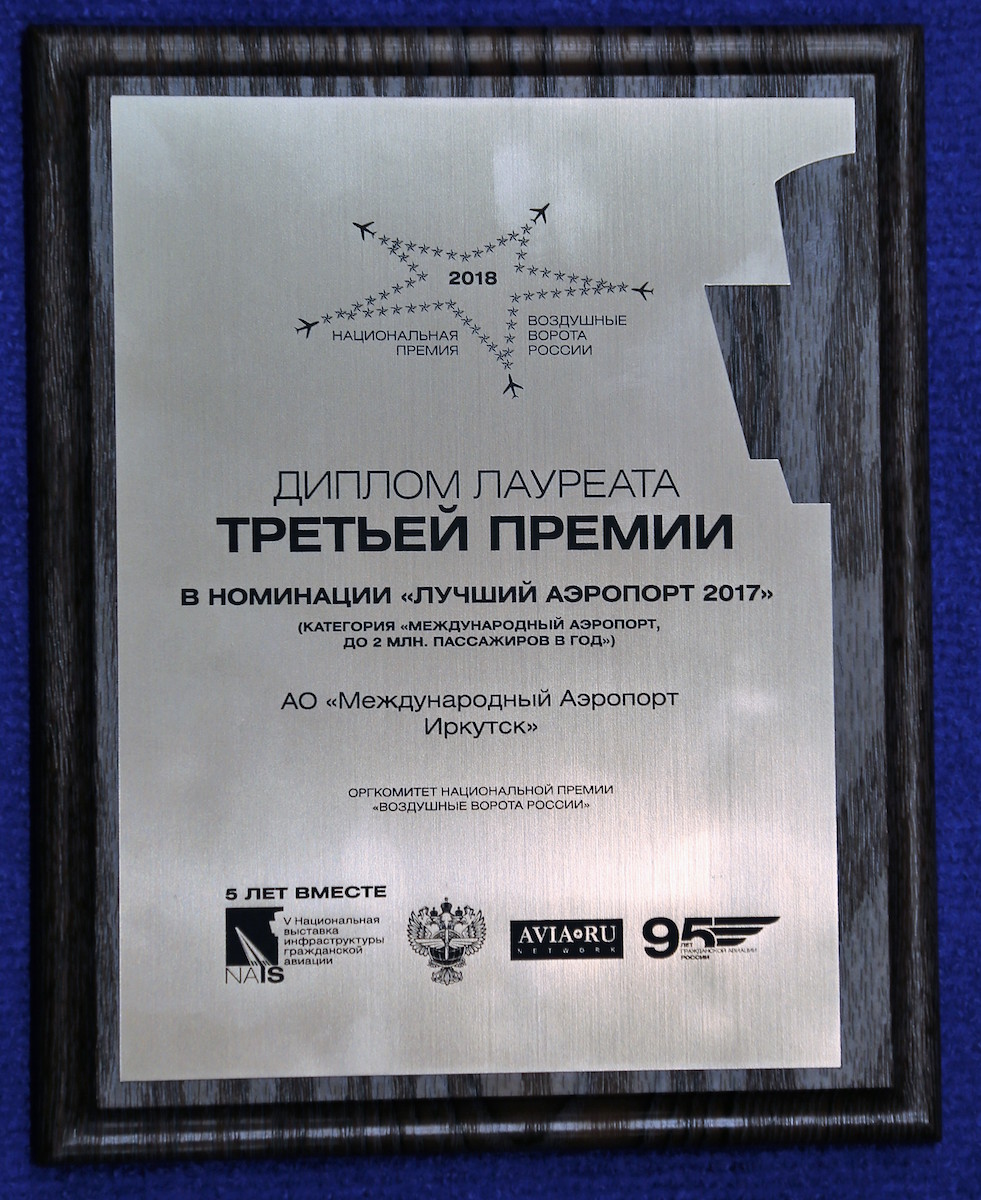 Международный аэропорт Иркутска стал лауреатом Третьей национальной премии «Воздушные ворота России» в номинации «Лучший аэропорт 2017». Диплом вручили в категории «До 2 млн пассажиров в год».