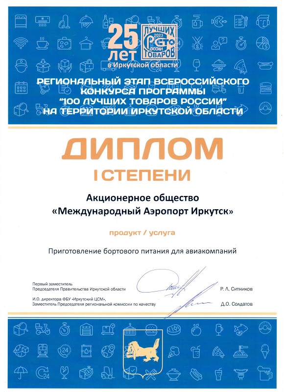 Региональный этап Всероссийского конкурса «100 лучших товаров России 2023» завершился в Иркутске. АО «Международный аэропорт Иркутск» уже второй раз принял участие в программе в номинации «Услуги для населения». На конкурс от предприятия были представлены такие услуги, как аэропортовая деятельность и приготовление бортового питания для авиакомпаний.